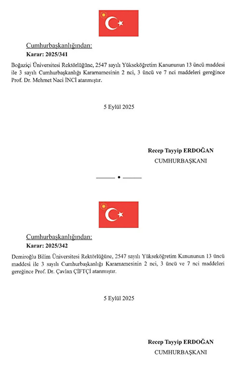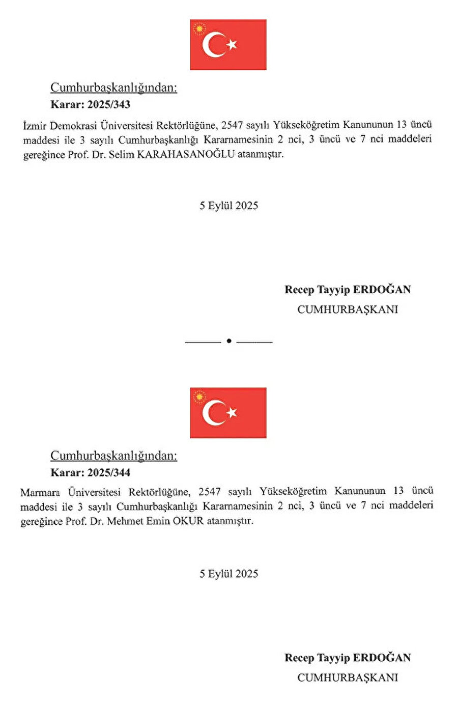 Resmi Gazete'de yayımlanan karara göre, Afyonkarahisar Sağlık Bilimleri Üniversitesi Rektörlüğüne Prof. Dr. Adem Aslan, Boğaziçi Üniversitesi Rektörlüğüne Prof. Dr. Mehmet Naci İnci, Demiroğlu Bilim Üniversitesi Rektörlüğüne Prof. Dr. Çavlan Çiftçi, İzmir Demokrasi Üniversitesi Rektörlüğüne Prof. Dr. Selim Karahasanoğlu ve Marmara Üniversitesi Rektörlüğüne ise Prof. Dr. Mehmet Emin Okur atandı.