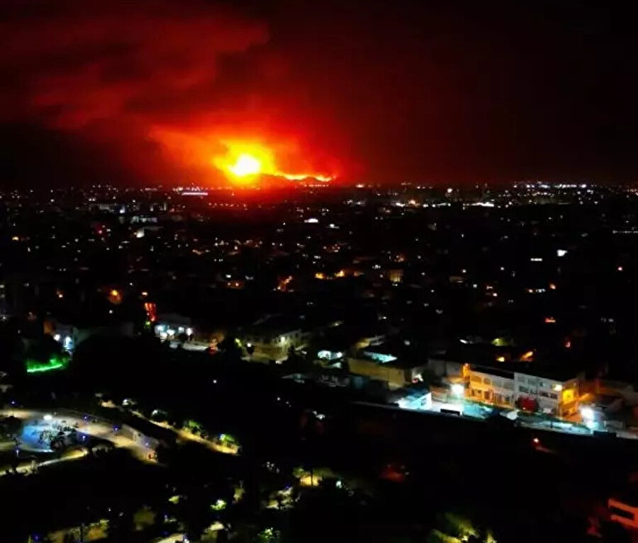 Vadide kalan köy, tepedeki alevlerin tehdidi altında. Geceyi kızıla boyayan yangına karşı ekiplerin ve vatandaşların mücadelesi sürüyor. Yükselen alevler dron ile havadan görüntülendi.