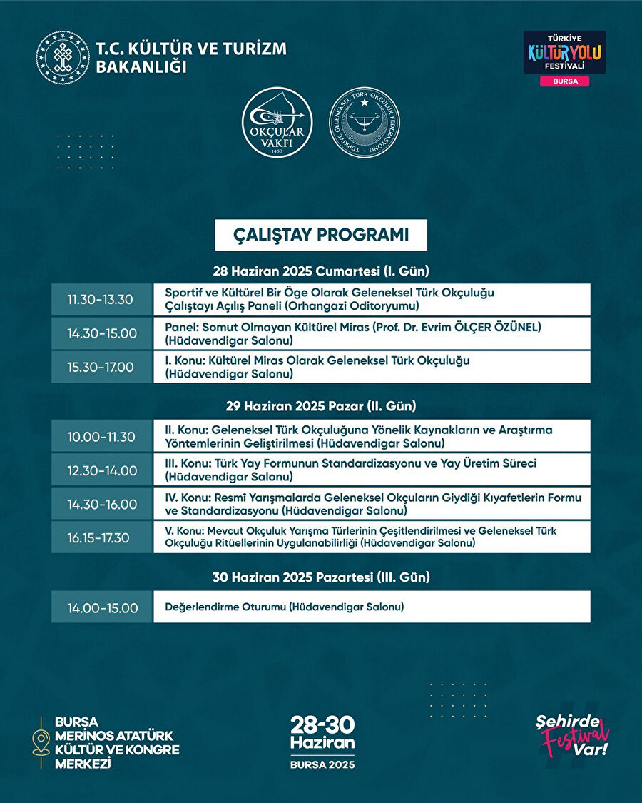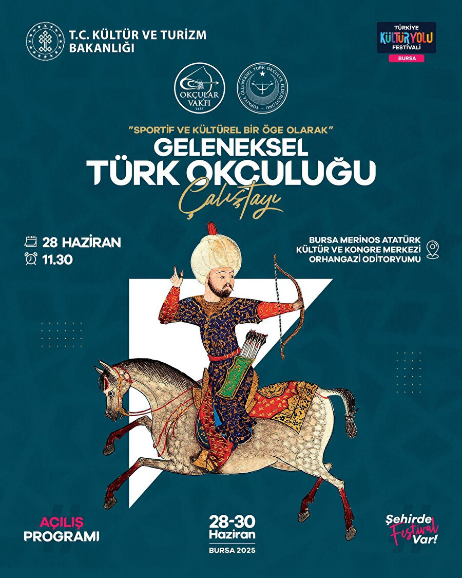 Bursa Kültür Yolu Festivali Etkinlikleri kapsamında ve Okçular Vakfı tarafından düzenlenecek olan Sportif ve Kültürel Bir Öge Olarak Geleneksel Türk Okçuluğu Çalıştayı, 28-30 Haziran 2025 tarihleri arasında Bursa’da, Merinos Atatürk Kongre ve Kültür Merkezi’nde gerçekleştirilecek. T.C. Kültür ve Turizm Bakanlığı Yaşayan Miras ve Kültürel Etkinlikler Genel Müdürlüğü ile Türkiye Geleneksel Türk Okçuluk Federasyonu’nun paydaş olarak yer aldığı bu önemli etkinlik ile, öncelikli olarak, geleneksel okçuluğun geçmişi ve geleceği arasında bir köprü kurma hedeflenmekte.