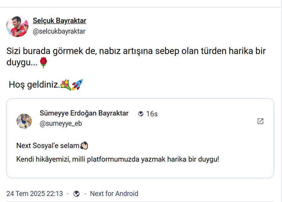 - "Next Sosyal'e selam. Kendi hikayemizi, milli platformumuzda yazmak harika bir duygu."