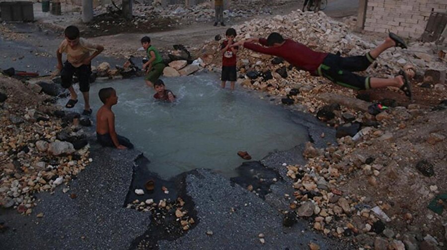 Halep'in Şeyh Said Mahallesi'nde çekilen görüntülerde çocukların yıkıntılar arasındaki havuzda yüzdükleri görülüyor.