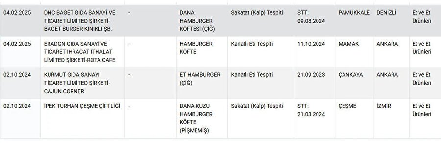 'Taklit veya Tağşiş Yapılan Gıdalar' ve 'Sağlığı Tehlikeye Düşürecek Gıdalar' listesine yeni ürünler eklendi. Bu kez de hamburger ürünlerinde sorunlar meydana geldi.