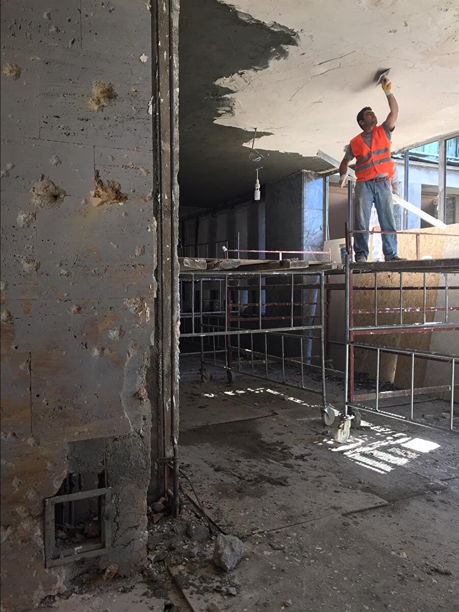 TBMM Ana Binası'nın, FETÖ'nün darbe girişiminde bulunduğu 15 Temmuz gecesi bombalanan bölümlerinin tadilat ve tamiratı devam ediyor. Bombadan etkilenen duvarlar, kapılar ve pencereler ile iç bahçeler elden geçirildi, yenilendi.