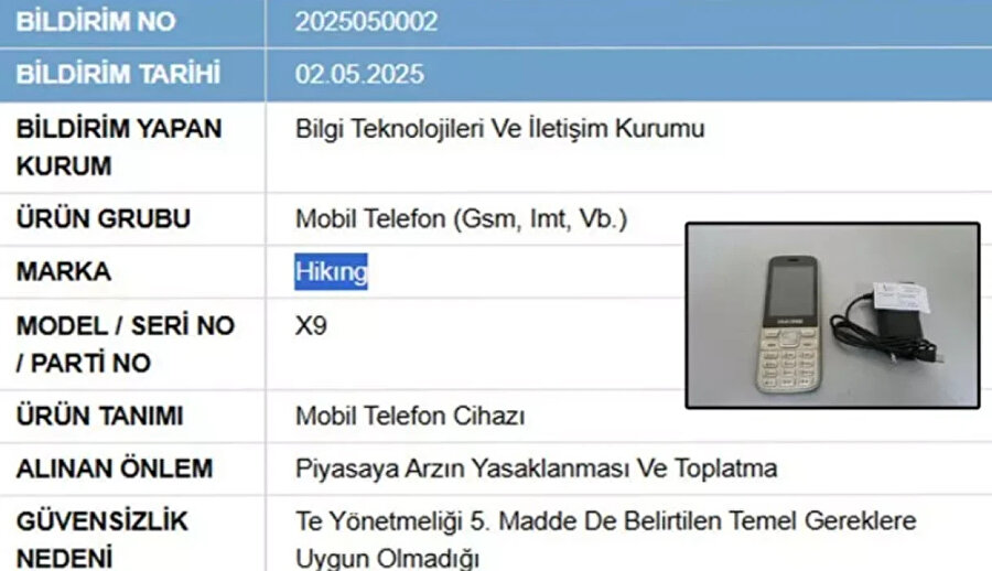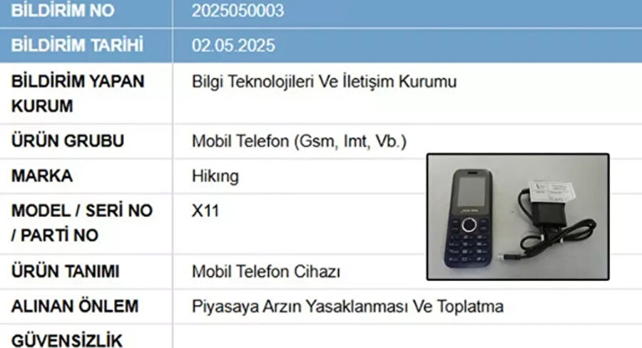 Toplamda dört cep telefonu modelinin yer aldığı listede, Hikıng markasına ait iki cihaz dikkat çekti. Bakanlık, bu telefonların teknik olarak güvenli olmadığını ve bazı önemli uyumluluk kriterlerini yerine getirmediğini belirtti.