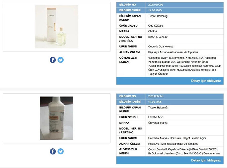 Yapılan denetimlerin ardından Bakanlık, Chakra marka oda kokusu ve bir adet temizlik ürününün kullanımının sağlıksız olduğunu tespit etti.