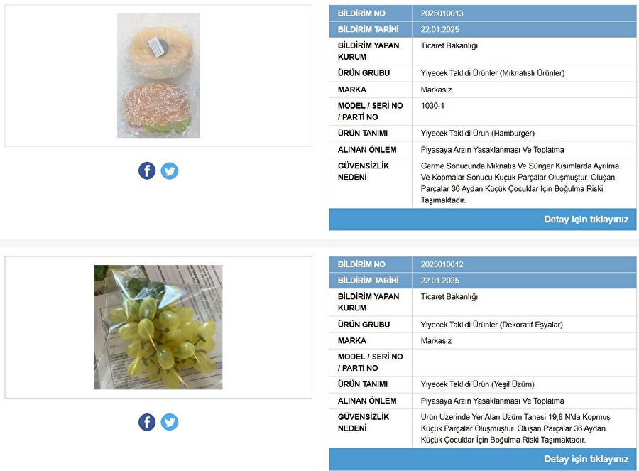 Ticaret Bakanlığı, piyasa gözetimi ve denetimi faaliyetleri kapsamında yapılan son incelemeler sonucunda, markasız iki yiyecek taklidi dekoratif ürünün sağlıksız olduğu tespit edildi.