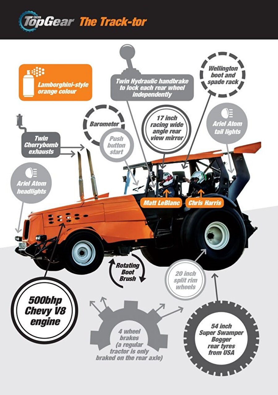 Saatte 140,2 kilometre hıza ulaşmayı başaran Top Gear imzalı özel traktöre Track-tor adı verildi. Bu pazar ekranlara gelecek programın yeni sezondaki beşinci bölümü, hız rekoru kıran traktör ile yapılan diğer çılgınlıkları ekrana taşıyacak. Sunuculuğunu Matt LeBlanc, Chris Harris ve Rory Reid'in üstlendiği Top Gear, gelecek hafta yayınlanacak altıncı bölüm ile 25. sezonu noktalayacak.