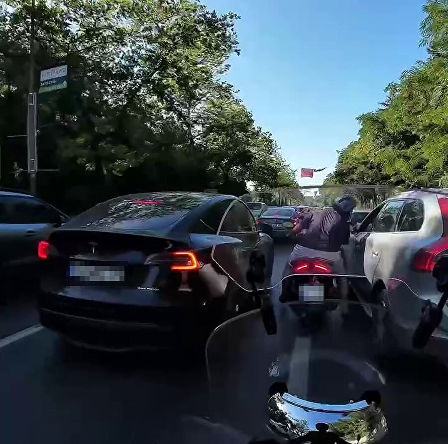 İstanbul’da bir motosiklet sürücüsü trafikte seyir halinde olduğu esnada kendisine arkadan çarpan araç sürücüsüyle tartıştı. Motosiklet sürücüsü daha sonra araç şoförüne tükürerek olay yerinden ayrıldı.