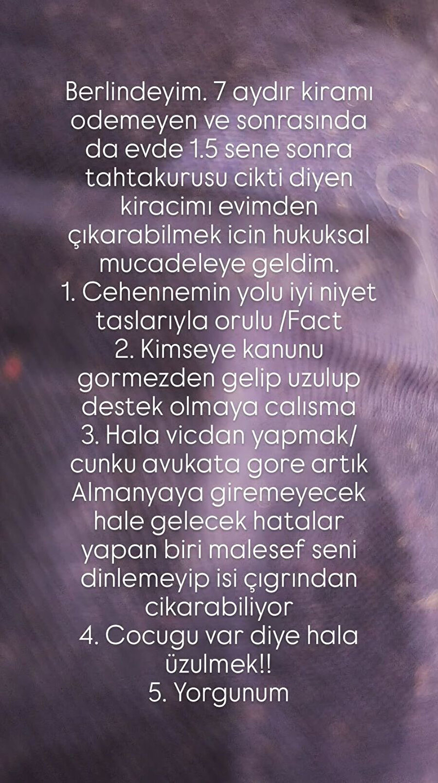 Ünsal, paylaşımında şu ifadeleri kullandı: "Berlin’deyim. Yedi aydır kiramı ödemeyen ve ardından da evde bir buçuk sene sonra tahta kurusu çıktığını söyleyen kiracımı çıkarabilmek için hukuksal mücadeleye geldim. 'Cehennemin yolu iyi niyet taşlarıyla örülü' Kimseye kanunu görmezden gelip üzülüp destek olmaya çalışma; hâlâ vicdan yapmanın anlamı yok. Avukata göre artık Almanya'ya giremeyecek hâle gelecek hatalar yapan biri, maalesef seni dinlemeyip işi çığırından çıkarabiliyor. Çocuğu var diye hâlâ üzülmek… Yorgunum."