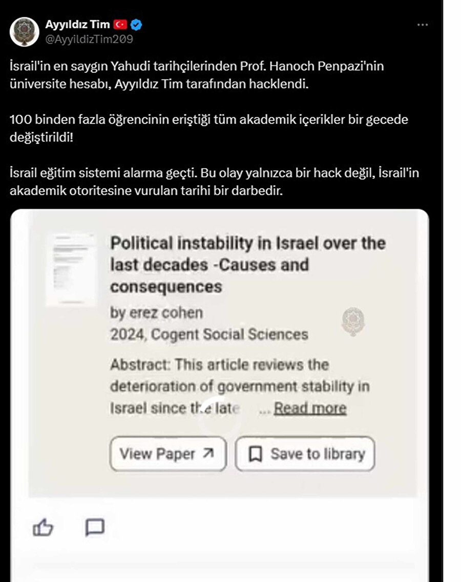 İsrail’deki bir üniversitede görev yapan Prof. Penpazi’nin dijital eğitim platformuna erişim sağlayan hesabı, Ayyıldız Tim’in siber saldırısına uğradı.