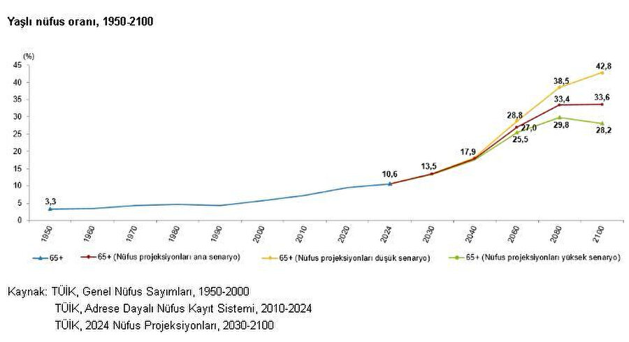 Nüfus projeksiyonlarına göre yaşlı bağımlılık oranının 2030'da yüzde 19,5, 2040'ta yüzde 26,5, 2060'ta yüzde 45,5, 2080'de yüzde 61,9 ve 2100'de yüzde 61,6 olacağı öngörüldü.