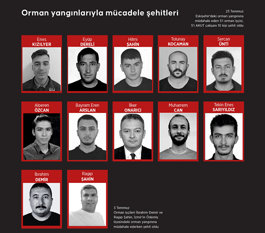 Eskişehir'in Seyitgazi ilçesinde çıkıp Afyonkarahisar'a sıçrayan orman yangınına müdahale eden 5'i orman işçisi, 5'i AKUT gönüllüsü 10 kişi şehit olmuştu. Yangında şehit olan kahramanlar son yolculuklarına uğurlandı.