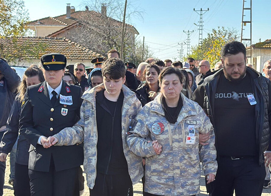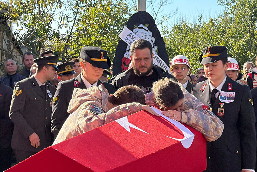 Duygu Aykut, cenazeye oğlu Poyraz ile birlikte eşinin parkasını giyerek katıldı. Anne ile oğlu, Türk bayrağına sarılı tabuta sarılıp, gözyaşları döktü. Tabuta sarılıp gözyaşı döken şehidin annesi Zülbiye Aykut, yakınları tarafından teselli edildi.