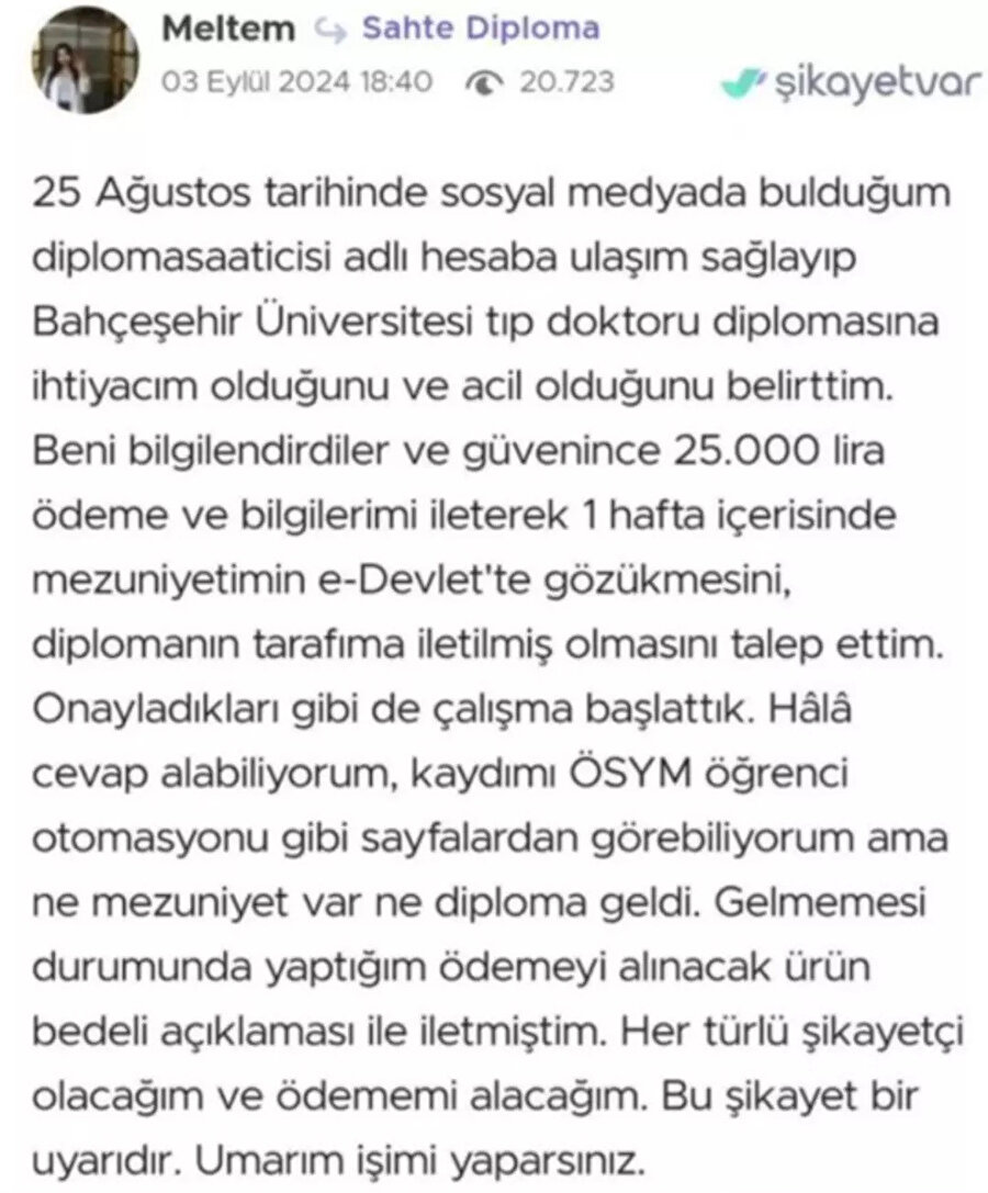 Sahte diploma almak için başvuru yapanlar, dolandırıldıklarını iddia ederek şikayet yağdırdı. Sahte diploma vaadiyle dolandırılan kişilerin sayısı giderek artarken mağdurlar; yüksek meblağlar ödeyerek sahte diploma satın aldıklarını ve bu durumun kendileri için büyük bir mağduriyet yarattığını belirtiyorlar.