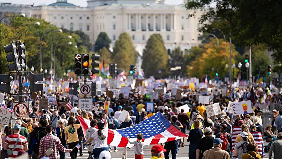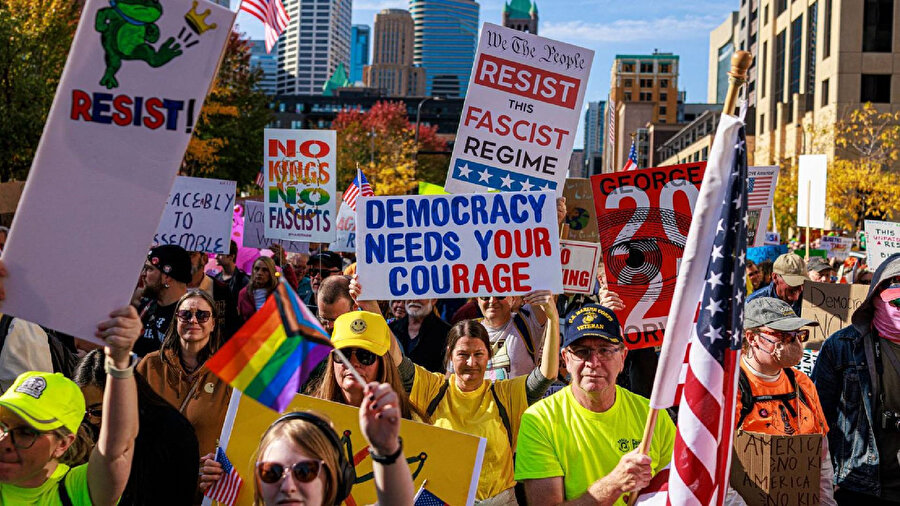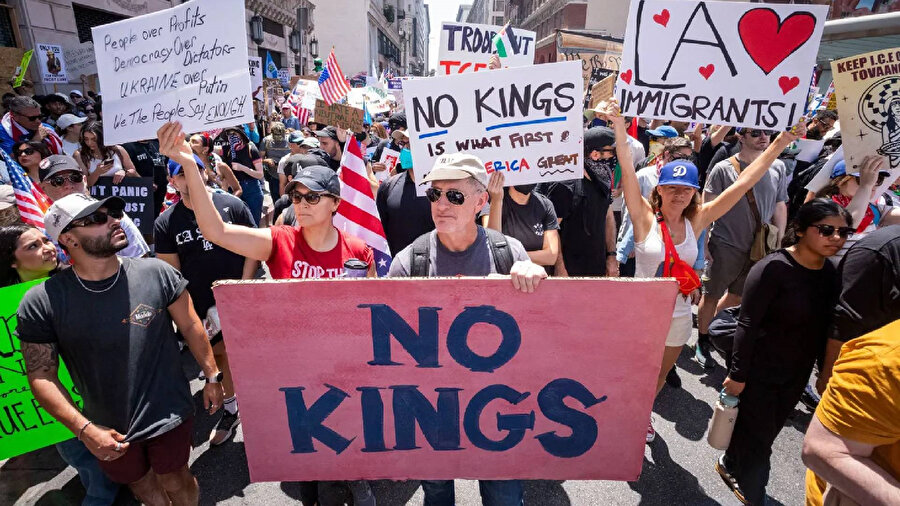 ABD’nin 50 eyaletinde hafta sonu, Trump’a karşı “Krallara Hayır” (No Kings) protestoları düzenlendi. Büyük şehirlerden kasabalara 2.500 bölgedeki eylemlere 7 milyon kişinin katıldığı belirtiliyor. Trump’ın ülkeyi daha “militer ve otokratik” yönetime götürdüğünü savunan göstericilere Avrupa’daki birçok şehirden de destek geldi.