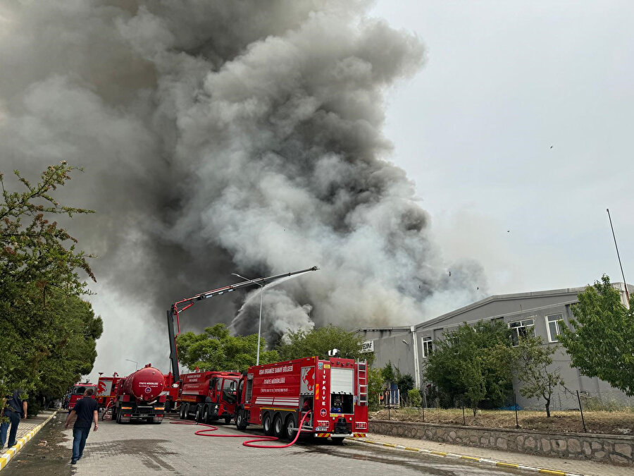 Yangın nedeniyle hasarın oluştuğu fabrika ve depoda soğutma çalışması yapıldı.