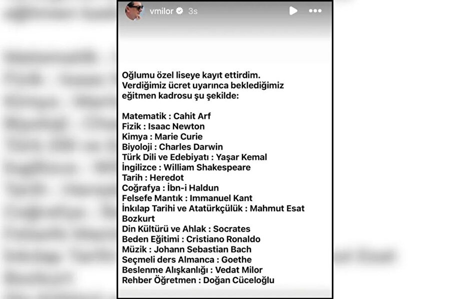 İronik bir paylaşımda bulunan Milor, "verdiğimiz ücret uyarınca beklediğimiz eğitmen kadrosu şu şekilde" diyerek bir öğretmen kadrosu paylaştı: