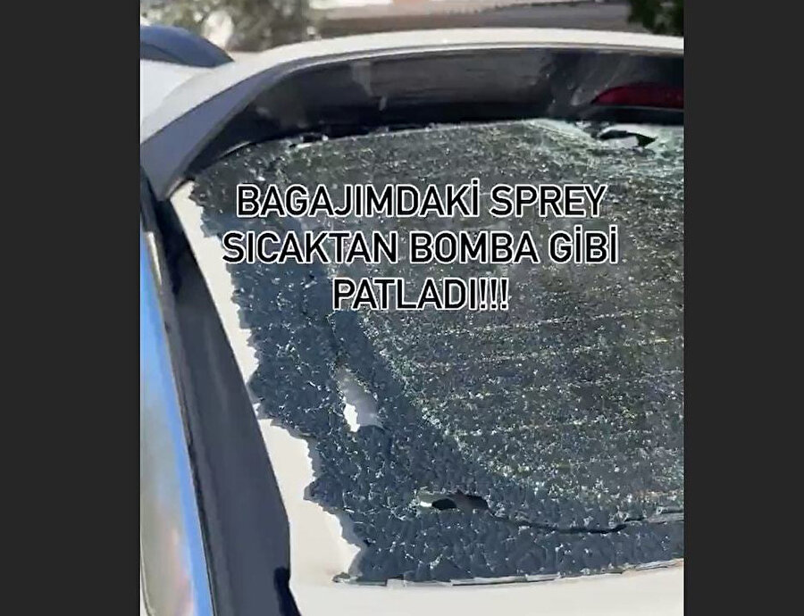 Bunlardan biri, sosyal medyada paylaşılan bir görüntüyle gündeme geldi. Bir kadın, arabasında unuttuğu sprey şişesinin patlaması sonucu aracının camının paramparça olduğunu gösteren görüntüleri paylaştı.