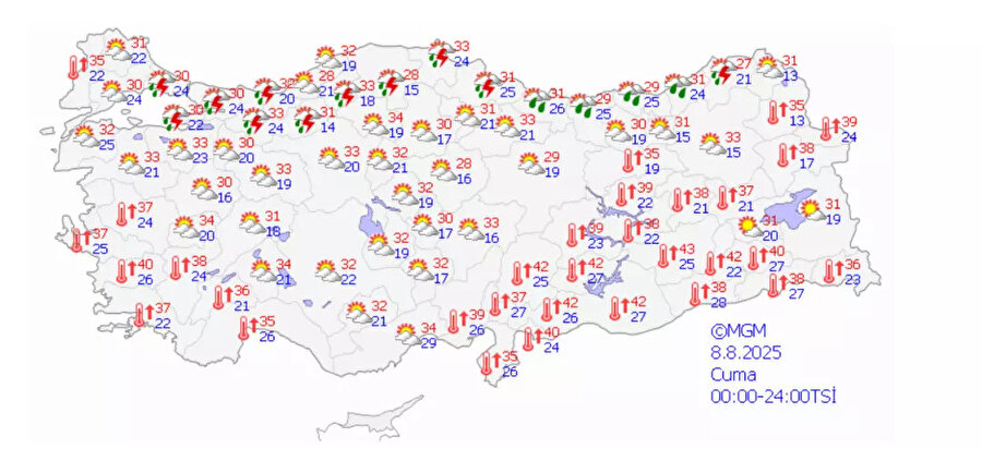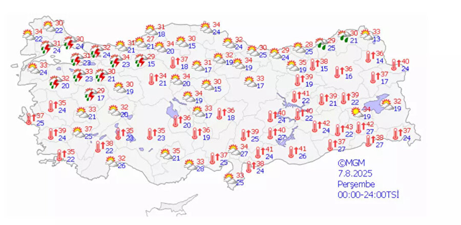 Meteoroloji Genel Müdürlüğü tarafından yapılan tahminlere göre: Yurdun kuzey, iç ve batı kesimlerinin parçalı, yer yer çok bulutlu, Denizli, Afyonkarahisar ve Kütahya çevreleri, Batı Akdeniz'in iç kesimleri ile Toroslar Mevkii, Doğu Karadeniz kıyıları ile Artvin ve Ardahan çevrelerinin yerel olmak üzere sağanak ve gök gürültülü sağanak yağışlı, diğer yerlerin az bulutlu ve açık geçeceği tahmin ediliyor.