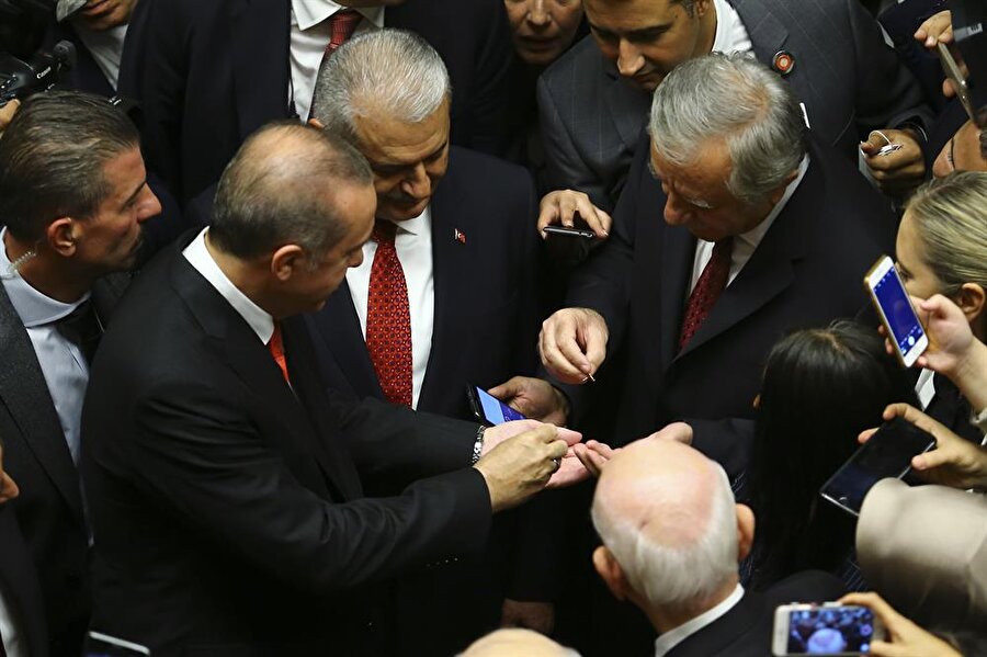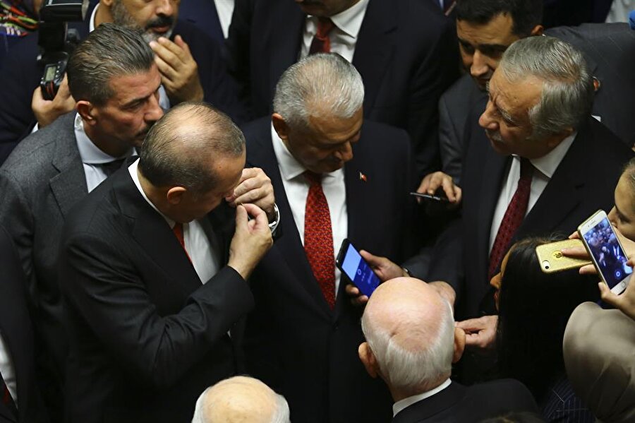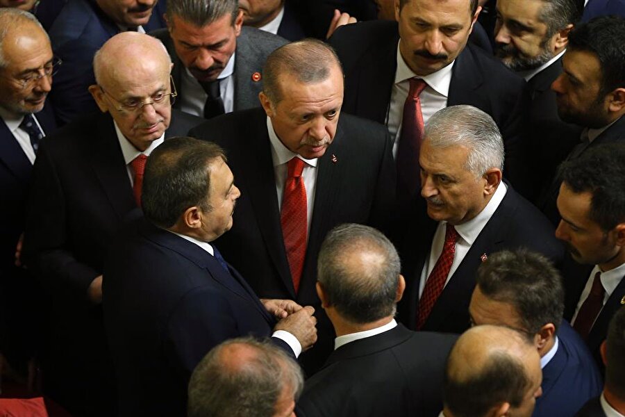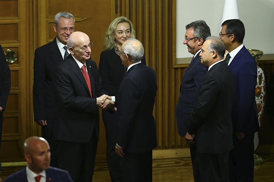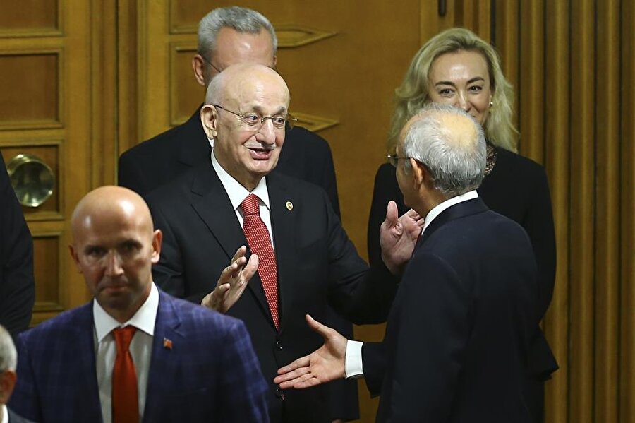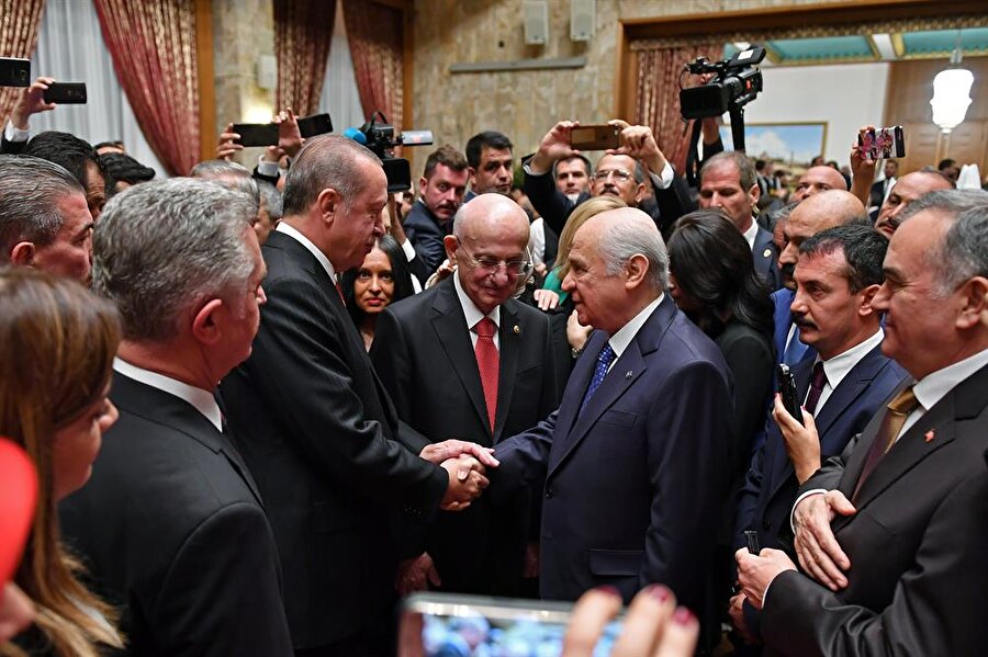 TBMM Başkanı Kahraman ile salonu dolaşan Cumhurbaşkanı Erdoğan, Başbakan Yıldırım, MHP Genel Başkanı Bahçeli, BBP Genel Başkanı Mustafa Destici ve DSP Genel Başkanı Önder Aksakal ile selamlaştı.