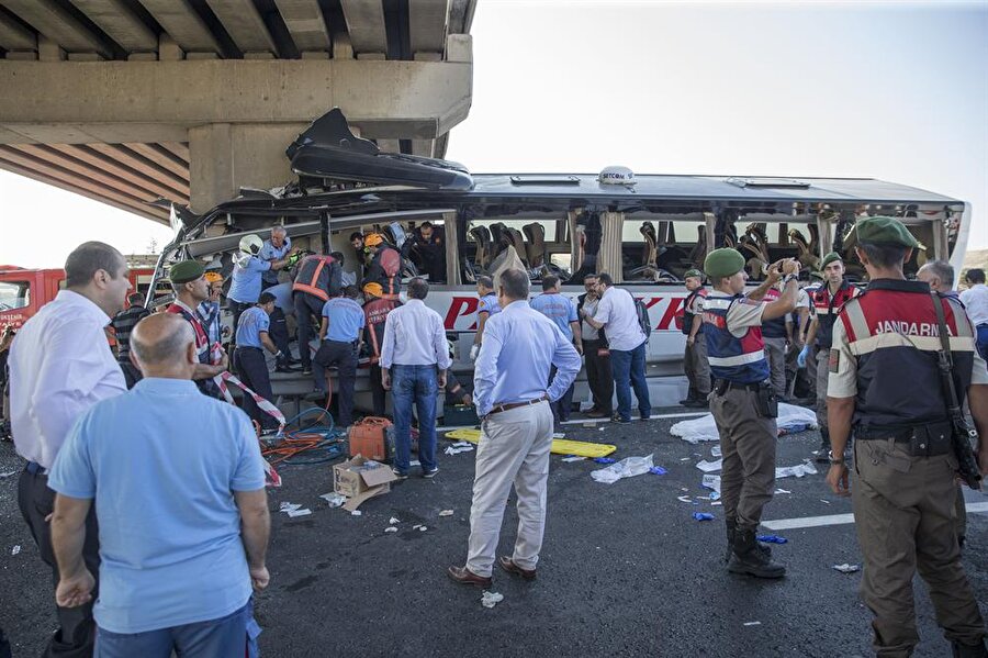 Kaza sonucu otobüste yolcular sıkıştı. İtfaiye ekipleri kurtarma çalışmaları başlattı.