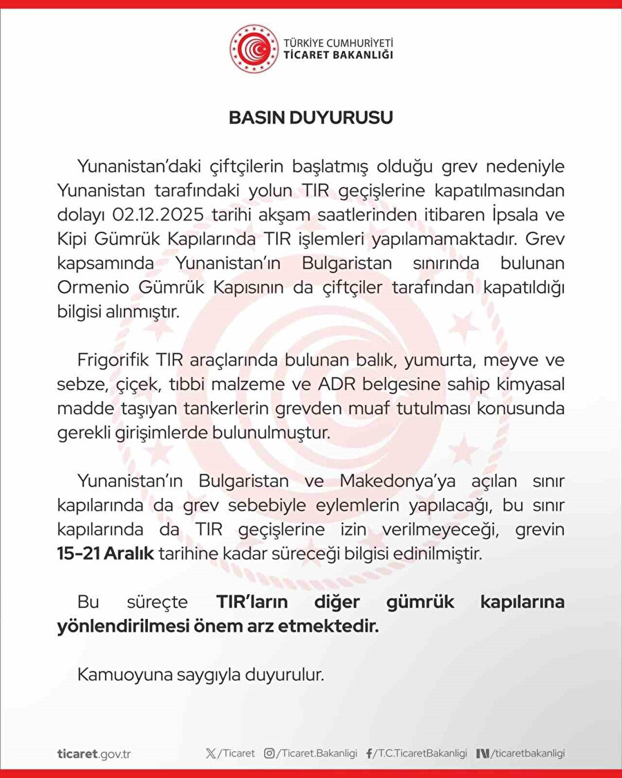 Yunanistan’ın Bulgaristan ve Kuzey Makedonya’ya açılan diğer kapılarında da 15–21 Aralık tarihleri arasında tır geçişlerinin tamamen duracağı bildirildi. Bu karar, uluslararası taşımacılıkta ciddi gecikmeler yaşanabileceğine işaret ediyor.