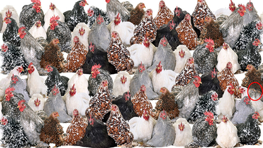 Dikkat gerektirebilen bu optik illüzyon testi, adeta zeka sınırlarını zorlayabiliyor. Nitekim bu testte tavuklar çoğunlukta bulunurken, aralarında yalnızca bir yavru kedi yer alıyor. Optik illüzyon testinde istenen, gizli görselinin 9 saniyede tespit edilmesi.