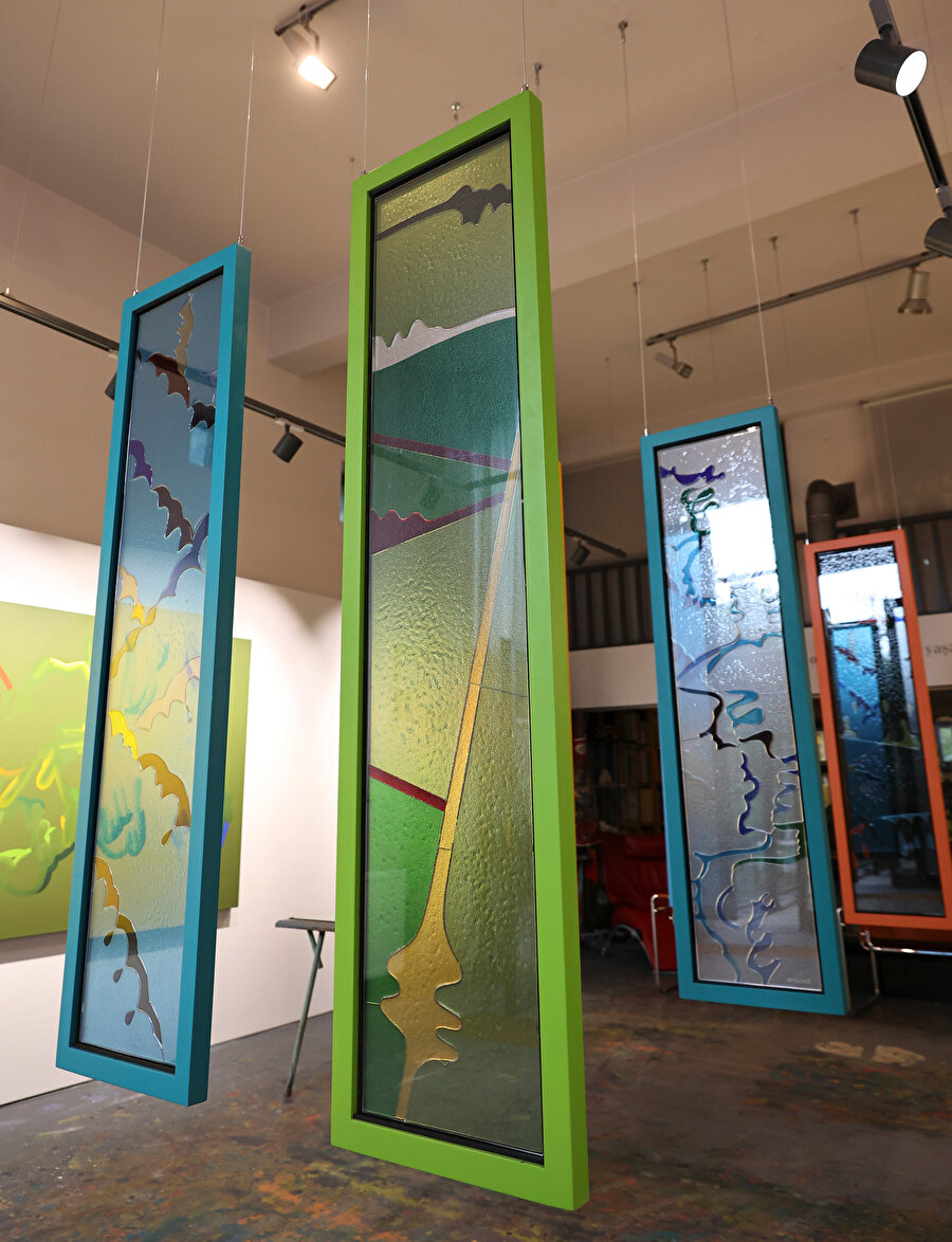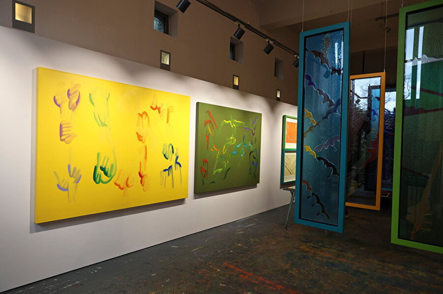 Ata’nın 2014’ten bu yana sürdürdüğü “Askıda” yapıtları, tuvalden kağıda, soyuttan vitraylara uzanan bir deneysel çeşitlilik taşıyor. “Askıda Akışkan Bedenler” başlıklı vitray işleri ise sanatçının üretiminde yeni bir kapı aralıyor.