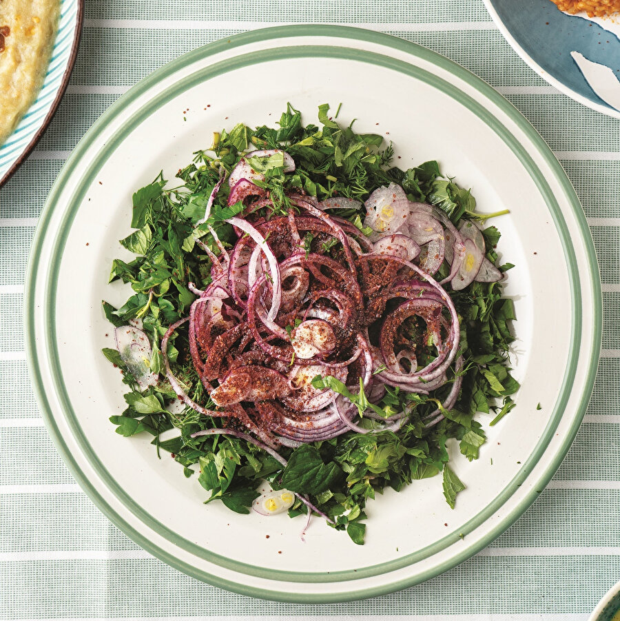 Ali nazik ve bulgur pilavının yanına çok yakışacağını düşündüğümüz mor soğanlı yeşil salatayı 10 dakikada hazırlayabilirsiniz.