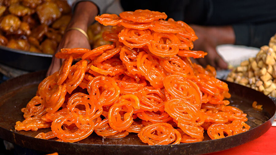 Hint dizilerini izleyenlerin yakından tanıyacağı jelebi, Hindistan'da her özel günde yapılan ilk tatlı. Spiral şekil verilen hamurun kızartılıp daha sonra şerbete batırılmasıyla yapılan jelebi, bizim halka tatlısının yandan çakması gibi.