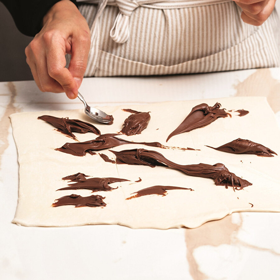 Adım 2: Merdane ile hamuru biraz inceltin. Üzerine fındık kremasını sürün.