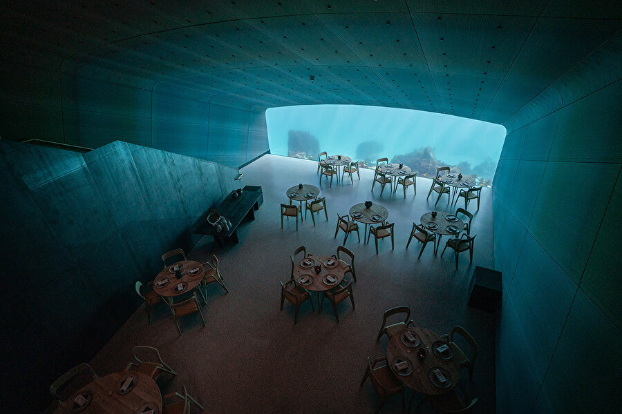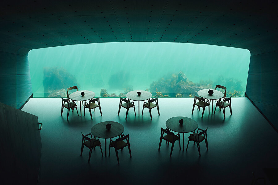 Denizin ortasında yarı batık bir yapı olarak yükselen restoran, dışarıdan bakıldığında adeta dalgaların arasında kaybolmuş devasa bir kaya kütlesini andırıyor. İçeriye adım attığınızda ise sizi zarif ahşap ve çelik detaylarla tasarlanmış bir merdiven karşılıyor. Bu merdiven sizi yavaş yavaş suyun altına, restoranın kalbine götürüyor. Büyük panoramik camlardan içeri süzülen ışık, dalgaların dansını ve yanınızda yüzen balıkları gözler önüne seriyor.