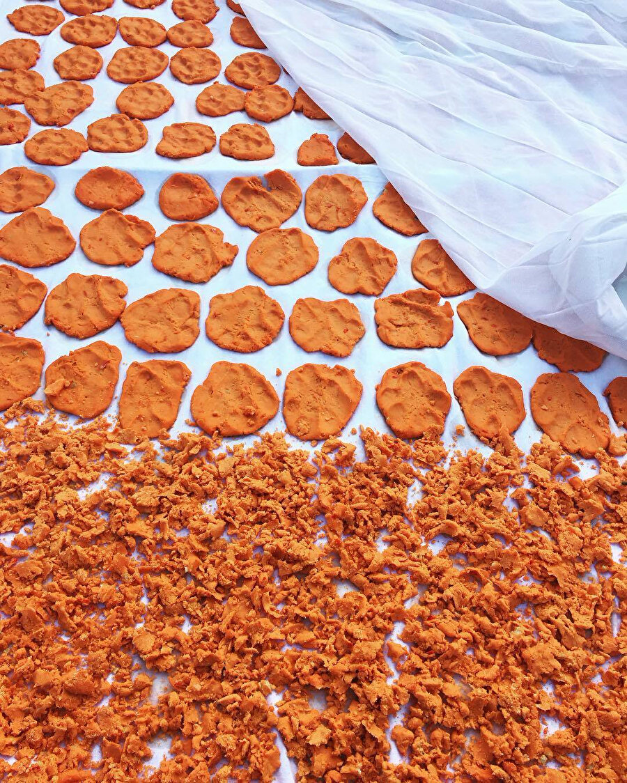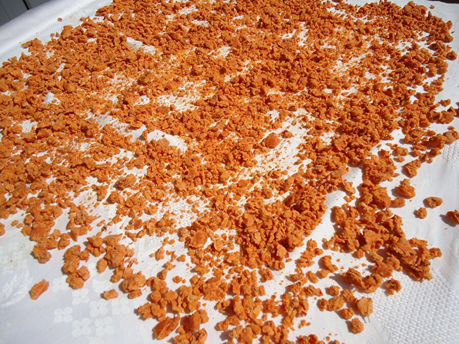 Mayalanan hamuru küçük parçalar halinde temiz bir bezin üzerine serin. Mümkünse eğer bu işlemi güneş alan, havadar bir yerde yapın ki kuruma işlemi hem daha kolay olsun hem de tarhananız güneşin vitaminini içine çeksin. İyice kuruyana kadar 2 saatte bir parçaları ters çeviin ki her tarafı eşit şekilde kurusun. Kuruma süresi ne kadar havadar ve güneş gördüğüne göre değişecektir.