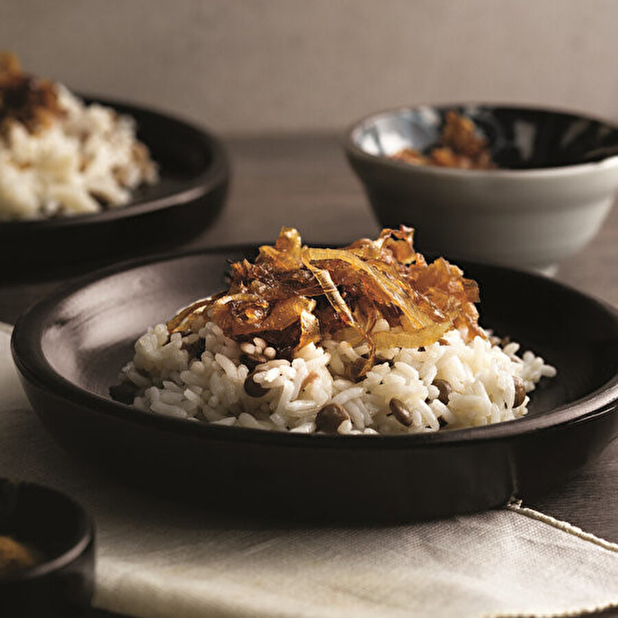 Kızarmış soğanlı mercimekli yasemin pilavı