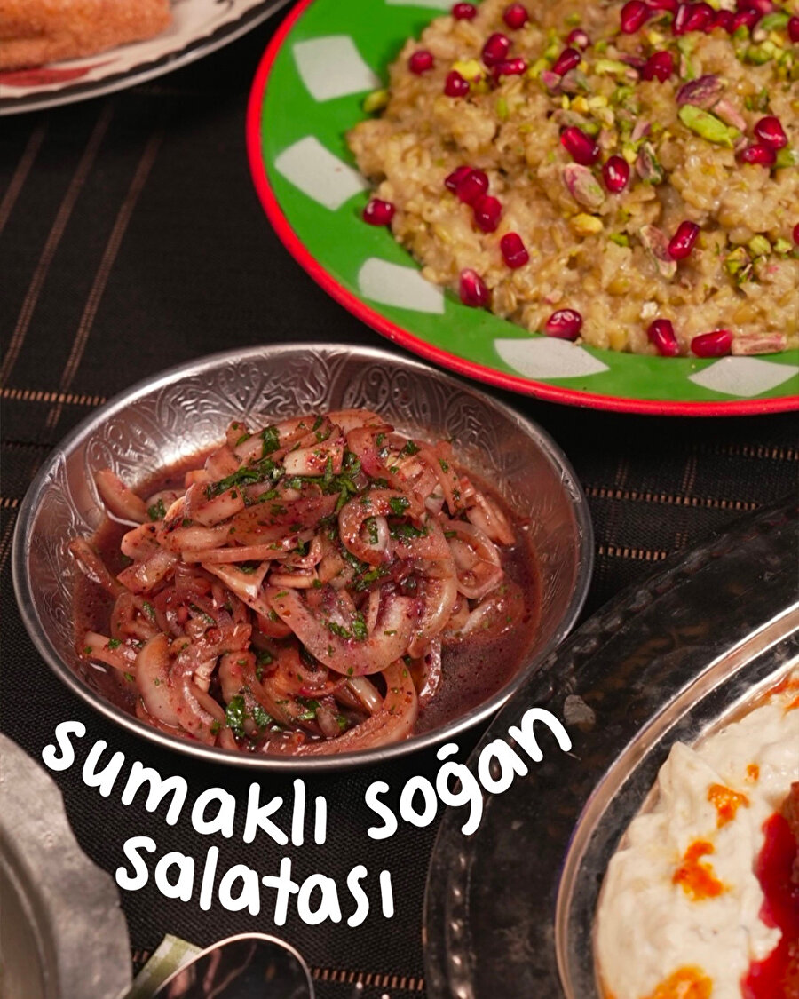 Antep mutfağını tamamlayan bir salata varsa o da sumaklı soğan salatası. İçli köfte, ali nazik ve firik pilavının yanına yakışacak olan bu eşlikçi, bunca uğraştıran tariflere nazaran da çok kolay. Soğanların tatlılığı sumağın ekşiliğiyle birleşince yedikçe yediren bir lezzete dönüşecek.