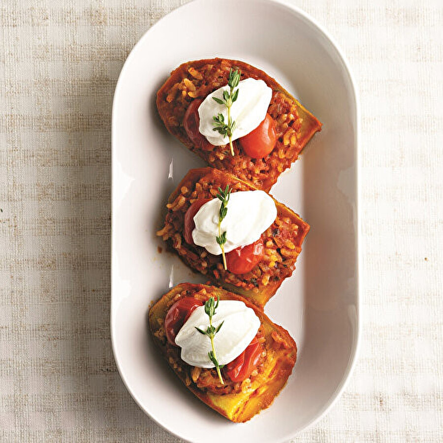 Kabak dolmasına biraz yenilik kattık ve ortaya kabak sefası çıktı. Hem göze hem de damaklara hitap eden, misafir sofralarına da çok yakışan reyhanlı kabak sefası, içine sandal olurken size sefa olacak!