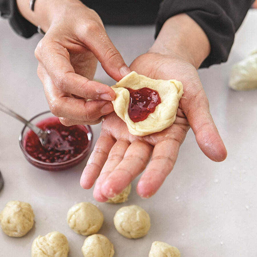 Adım 2: Ortasına reçelden paylaştırıp bohça gibi büzüp toparlayıp yuvarlayın. 30 dakika daha tezgahta dinlendirin.