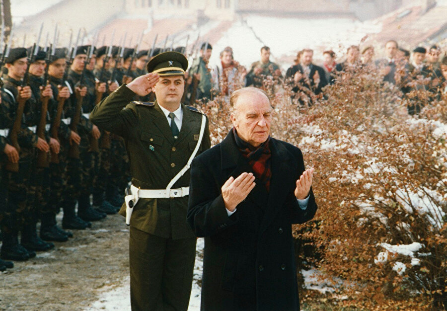 "Çin'den Sibirya'ya kadar uzanan komünist dünya, yenilmez gibi görünüyordu ve biz bu dünyanın içindeydik. Bu sistem, insanlardan hayatlarını ve özgürlüklerini istediği gibi alıyordu. Aliya İzetbegoviç, buna karşı çıktı ve bu yüzden iki kez hapishaneye girdi. Küçük bir adam, büyük bir sistemi alt etti. Aliya İzetbegoviç, cumhurbaşkanlığı döneminde başkanlık binasında kalıyordu, bu bina, ağır silahlarla 206 kez doğrudan vurulmuştu, korumaları yaralandı. Saraybosna'yı kuşatma altında tutan, soykırım yapan o ordu yok oldu ama merhum Aliya hayatta kaldı. Bu, onun hayatının mesajıdır."