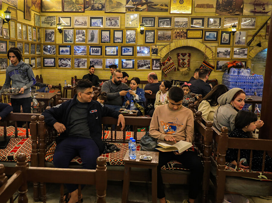 Memleket meselelerinin yoğun olarak tartışıldığı kahvehanenin duvarları, Irak’ta hüküm sürmüş siyasî liderlerin ve yabancı diplomatların fotoğraflarıyla dolu.