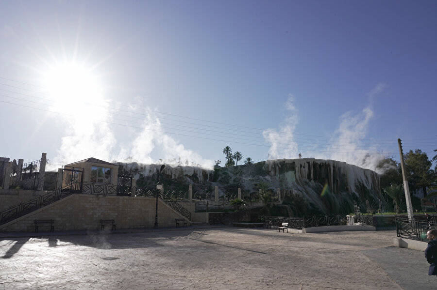 Yerin 10 kilometre altından yüzeye çıkan 95 dereceyi aşan sıcaklıktaki sular, göğe yükselen buharlar eşliğinde kalkerli topraktan oluşan yüksek kayaların arasından harika güzellikteki şelaleler halinde aşağı iniyor.