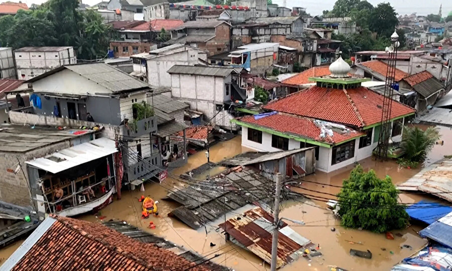 Şiddetli yağışlar nedeniyle Ciliwung Nehri’nin taşması sonucu başkentin doğu, batı ve güneyindeki 3 ilçe sular altında kaldı.
