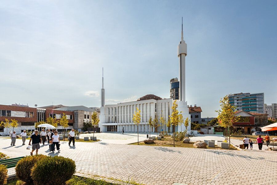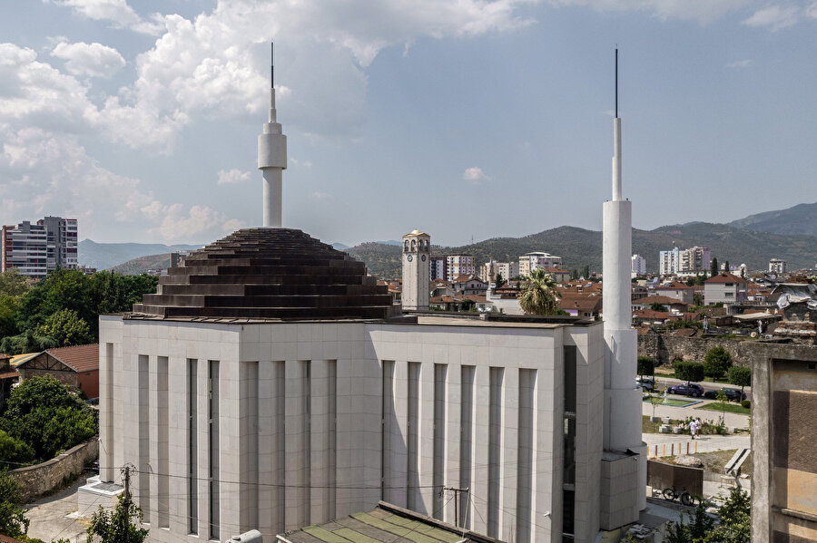Yaklaşık 1800 metrekarelik alanda bir kubbe ve iki minaresiyle "yeniden doğuşu" simgeleyen cami, Elbasan şehrinin merkezinde yer alıyor.