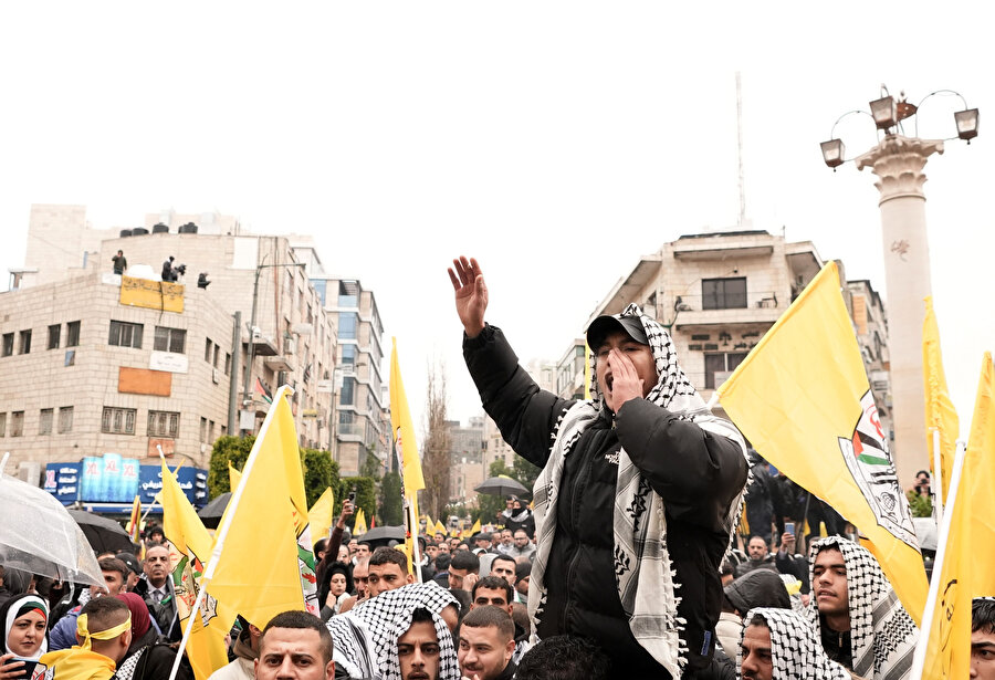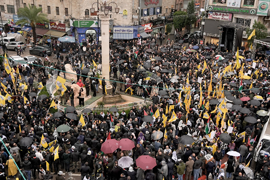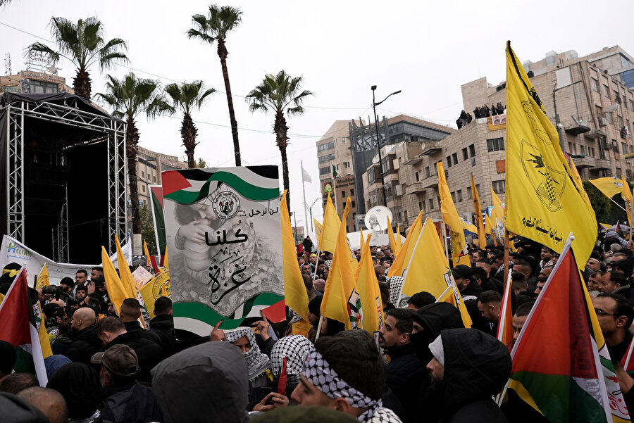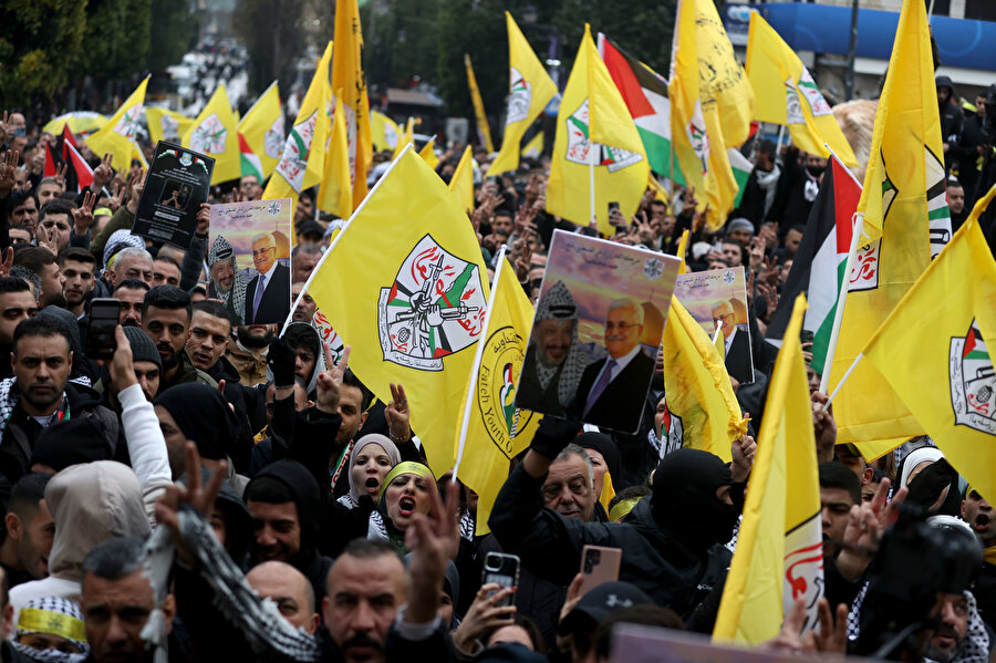 Fetih destekçileri, Filistin bayrakları, hareketin flamaları, merhum liderleri Yaser Arafat ve mevcut Devlet Başkanı Mahmud Abbas'ın fotoğraflarını taşıdı.