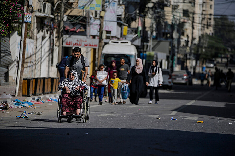 Gazze Şeridi'nin güneyine göçe zorlanan çocuk, kadın, yaşlı ve engellilerin de olduğu binlerce sivil, İsrail'in "güvenlik koridorları" olarak tanımladığı yollara düştü.