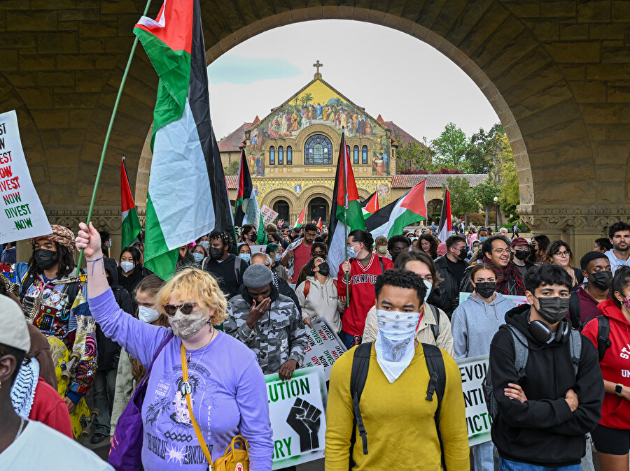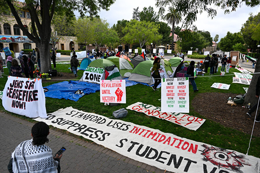 İsrail'in Gazze'ye yönelik saldırılarını protesto etmek için kamp kuran Stanford Üniversitesi öğrencilerinin eylemleri kampüsteki White Plaza Meydanı'nda devam ediyor.