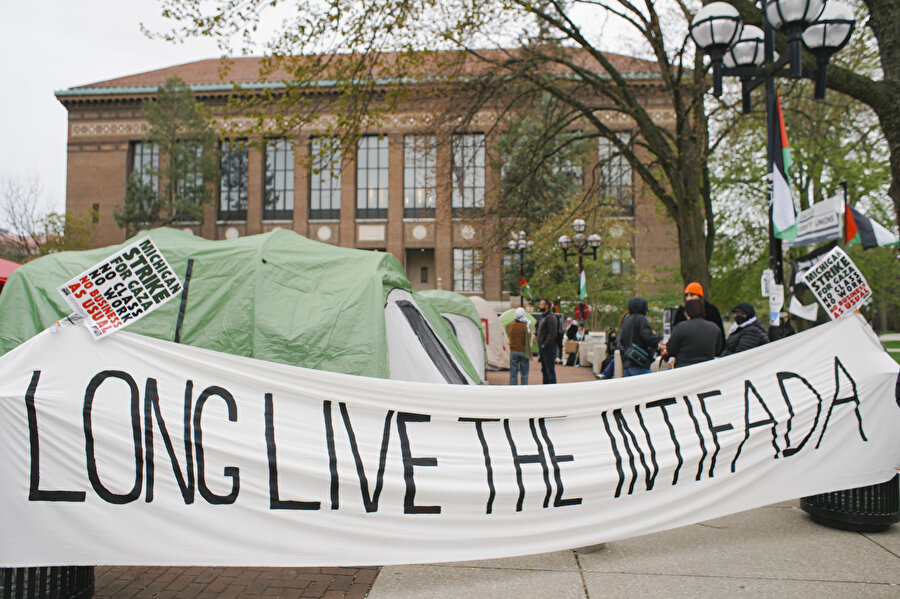 Michigan Eyalet Üniversitesi öğrencileri, okulun, Filistin işgalini ve Gazze'deki soykırımı destekleyen şirketlere devam eden finansal yatırımlarını protesto amacıyla kampüsün bahçesinde kamp kurdu.