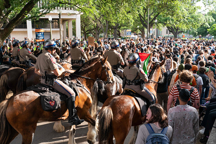İsrail’in Gazze saldırılarını ve Filistinli sivillere yönelik eylemlerini protesto eden 200 kadar öğrenci, geçtiğimiz gün öğlen saatlerinde Texas Üniversitesi Austin yerleşkesinde toplandı, polis ilk aşamada grubu yönlendirdiğini iddia ettiği 34 kişiyi gözaltına aldı. Bu sırada atlı birliklerin de dahil olduğu güvenlik güçleri ile öğrenciler arasında arbede yaşandı.