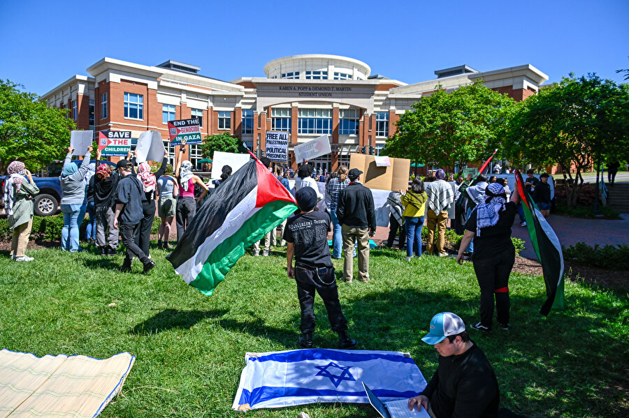 ABD'de başkent Washington'a yarım saatlik mesafedeki Maryland Üniversitesinden bir grup öğrenci, İsrail'in Gazze'deki saldırılarına tepki amacıyla üniversite kampüsünün bahçesinde eyleme başladı.