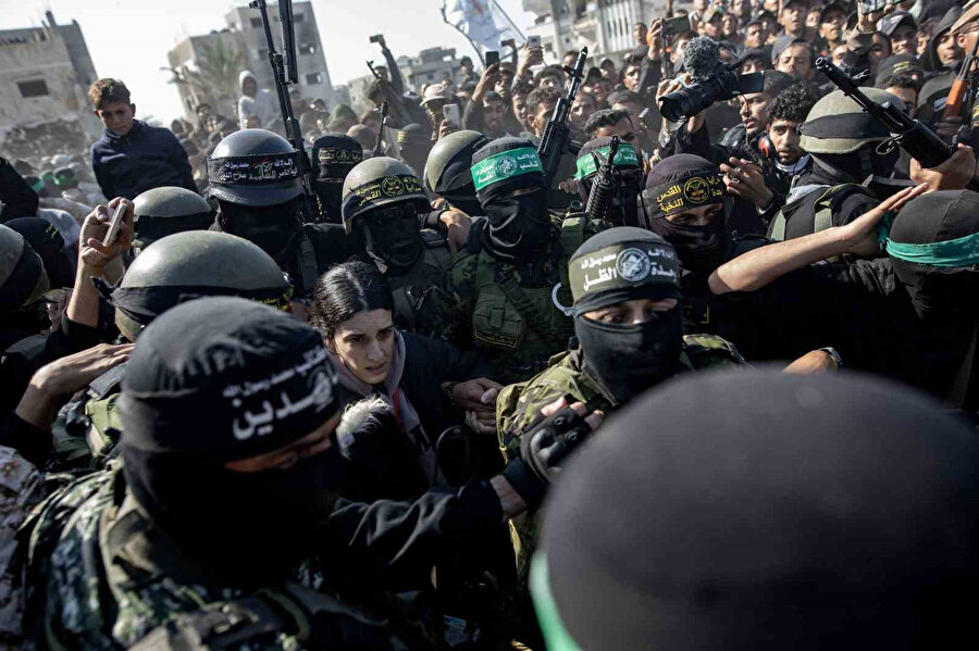 Hamas'tan yapılan yazılı açıklamada, Han Yunus ve Cibaliya Mülteci Kampı’nda esirlerin teslimi sırasında Filistinlilerin İsrail'in bölgede bıraktığı enkazın ortasında geniş katılımla toplandığı kaydedildi.
