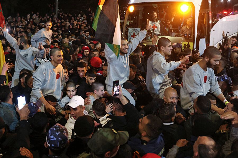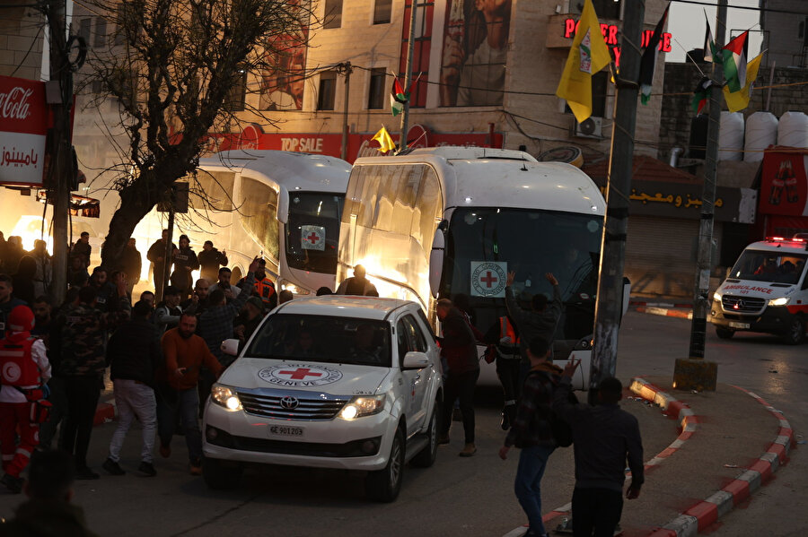 Filistinli 66 esiri taşıyan Kızılhaç konvoyu, Batı Şeria'daki Ofer Askerî Cezaevi'nden ayrıldıktan sonra Beytunya beldesinden ilerleyerek Ramallah'taki Tervihi Meydanı'na ulaştı.